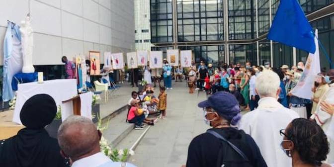 Suite et fin de l’escale parisienne pour le grand pèlerinage du « M de Marie » qui a tracé un grand « M » de 2000 km sur le sol de France, entre le 1er juin et le 13 septembre 2020, pour visiter les cinq sanctuaires marials qui forment un immense « M » sur le pays. Ce pèlerinage à pied, derrière la Vierge Notre-Dame-de-France, portée par une calèche à cheval, est passé par deux routes différentes : - alors que la calèche de la route Ouest, partie de Lourdes, s’est arrêtée au sanctuaire marial de Pontmain (Mayenne) pour le 15 août, les pèlerins de la route Est ont quitté Paris le mardi 18 août, après six jours passés dans la capitale. Ils y ont été accueillis en grande pompe par l’archevêque de Paris, Mgr Michel Aupetit lui-même, qui a notamment animé le chapelet du vendredi 14 août devant le parvis de Notre-Dame, avant de présider la messe du 15 août au Sacré-Cœur de Montmartre, en présence des pèlerins. Le lendemain, ils ont pris la direction de La Défense, où la calèche de Marie a fait un grand tour de la dalle pour bénir le premier quartier d’affaires d’Europe. La centaine de fidèles présents pour l’occasion a ardemment prié pour les près de 180.000 personnes qui sont employées dans ces immenses tours. Après avoir arpenté le grand parvis, ils ont assisté à la messe, juste à côté de la Grande Arche.