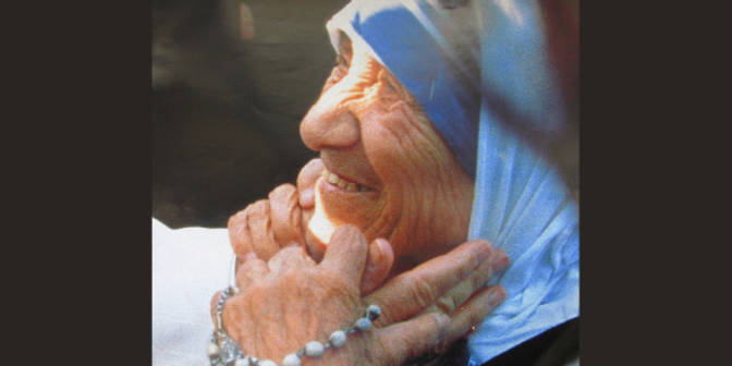 Dans son bureau, une statue de Marie entourée du chapelet de Mère Teresa
