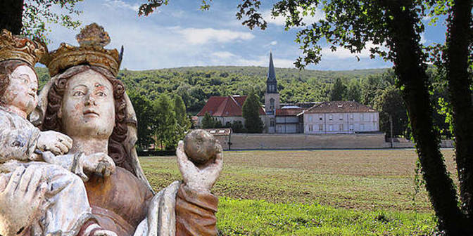 La commune française de Rambluzin-et-Benoite-Vaux se trouve dans le département de la Meuse, au nord-est de la France. La tradition veut qu’en ce lieu appelé autrefois « Martin-Han » (« la maison de Martin »), des bûcherons furent attirés par les chants célestes de l’Ave Maria… Ils découvrirent sur place une statue de la Vierge Mère, au pied d’un chêne déraciné. Émerveillés, ils décidèrent de lui élever un oratoire, dont un ermite eut la garde. Avec l’affluence des pèlerins, un lieu de culte plus important fut nécessaire. Une église fut construite sous le vocable de « l'Annonciation de la Vierge », et confiée aux Prémontrés vers 1140. Le nom de Benoîte-Vaux (« la Vallée Bénie ») apparaît ainsi pour la première fois en 1180 sur une bulle pontificale. Ce document confirme la donation en terres et en bois par l’évêque de Verdun (Meuse), Albéron de Chiny, à la jeune communauté de Prémontrés (ordre canonial catholique fondé par saint Norbert de Xanten au début du XIIe siècle), issue de l’Abbaye de l’Étanche. Le pèlerinage, qui attire encore de nombreux fidèles, a lieu chaque année la première semaine de septembre, avec, le 9 septembre, la fête de Benoîte-Vaux.