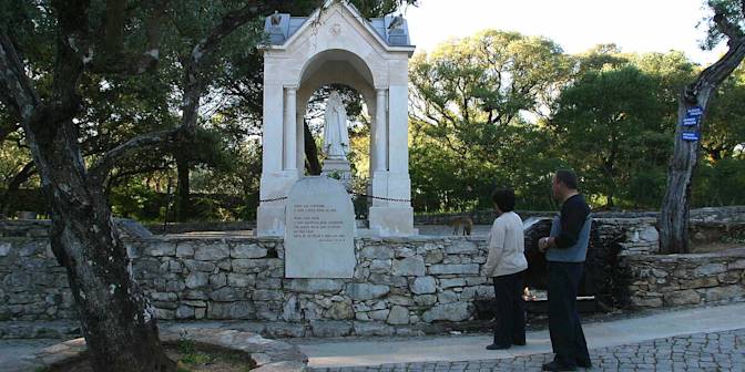 À quelques pas du Cabeço (de la colline), je rejoins mes amis, au lieu-dit Valinhos (Fatima, Portugal). C’est une aire circulaire, délimitée par un muret de pierre, entourée de nombreux arbres, semblable à un petit jardin public. À son centre, s’élève une grande statue de Notre Dame, protégée par un dôme de pierre. C’est ici que la Sainte Vierge apparut le dimanche 19 août 1917 aux petits bergers. Le rendez-vous mensuel avait été décalé car les voyants avaient été séquestrés par l’administrateur du canton, le treize de ce mois. Nous regardons attentivement la statue qui est relativement fidèle aux descriptions données par les voyants. Marie est simplement vêtue, elle n’a pas de couronne sur la tête. Elle porte une grande robe blanche, sans ceinture, en partie cachée par un voile épais qui descend jusqu’à ses pieds. Elle tient entre ses doigts un chapelet. En ce lieu, Marie à la fin de sa visite, ressentit une grande tristesse et déclara : « Priez, priez beaucoup et faites des sacrifices pour les pécheurs, car beaucoup d’âmes vont en enfer parce qu’elles n’ont personne qui se sacrifie et prie pour elles. »