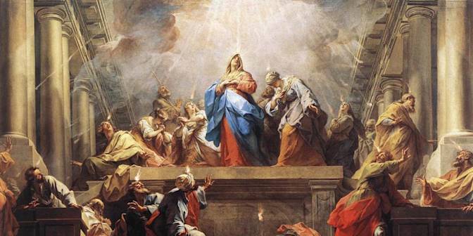 La prière ardente de Marie attire l’Esprit vivant sur les Apôtres, ceux que Jésus a choisis pour fonder son Eglise. C’est Marie qui amène à Jésus. C’est encore elle qui ramènera à lui. C’est elle dont nous avons besoin pour vivre et mettre en pratique ce que nous avons découvert en la présence vivante de Jésus. C’est Marie, notre Mère, qui nous amènera à la gloire. C’est elle qui nous amène à entrer dans ce mystère de gloire de la Pentecôte. En ce jour de Pentecôte, Marie est dans l’attente : comme à l’Annonciation, comme à la Résurrection, elle attend dans l’Espérance. Mais à la Pentecôte, elle n’est plus seule à attendre : elle attend avec les Apôtres qu’elle a rassemblés. Marie attire alors la manifestation de Dieu sur la terre. Mais elle n’est plus seule non plus à recevoir la manifestation de l’Esprit. Sa prière ardente attire l’Esprit vivant sur les Apôtres, ceux que Jésus a choisis pour fonder son Eglise.