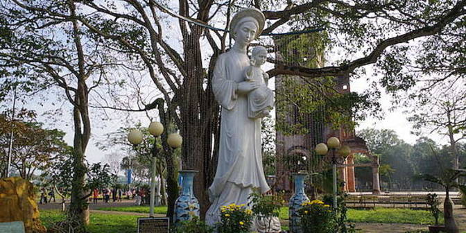 Au Vietnam, en 1798, des chrétiens s’enfuient dans la jungle pour échapper aux persécutions gouvernementales. C’est alors que, selon la tradition orale, ont eu lieu une série d’apparitions de la Vierge Marie : elle les réconfortait et les soutenait. Depuis lors, les pèlerinages n’ont jamais cessé. Telle est l'origine du sanctuaire de La Vang, à mi-distance entre le nord et le sud du pays. Cette tradition orale explique qu'en 1798, au centre du pays, à 60 km de Hué, ancienne capitale du Vietnam, dans une zone forestière, la Vierge, entourée de deux anges, « apparut » à un groupe de chrétiens pourchassés. « Elle était revêtue d’un manteau magnifique, à l’orientale, et tenait l’Enfant Jésus dans ses bras, explique un témoin. Elle se tenait simplement sur le gazon, comme une maman au milieu de ses enfants [...]. À tous elle demandait de se montrer joyeux d’avoir à souffrir pour leur foi. » « J’ai déjà exaucé vos prières. Dorénavant tous ceux qui viendront me prier en ce lieu verront leurs vœux exaucés », dit-elle. Selon certains, la Vierge serait apparue à plusieurs reprises. Guérisons et conversions sont alléguées. Ce pèlerinage et cette tradition de prière sont ininterrompus depuis lors. En 1901, une église est construite et bénie en présence de 12000 pèlerins et à cette occasion, Notre-Dame de La Vang est déclarée protectrice des catholiques du Vietnam. Un pèlerinage national s’y déroule tous les trois ans. En 1962, le pape Jean XXIII a élevé cette église au rang de basilique mineure, mais elle a été détruite en 1972-1975, pendant la guerre. Le 19 juin 1988 Jean-Paul II a canonisé 117 martyrs vietnamiens et il a fait mémoire du sanctuaire et a souhaité sa reconstruction « dans un climat de liberté, de paix, et de gratitude envers celle que toutes les générations disent bienheureuse ». Le souhait de ce saint Pape a été exaucé car le sanctuaire a été reconstruit !