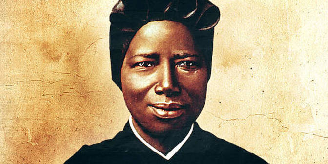 Joséphine Bakhita (1869-1947), ancienne esclave soudanaise devenue sainte, est très connue en Afrique, mais encore trop peu connue en Occident. Sa jeunesse est riche en événements peu communs, mais c'est la période où elle est religieuse qui est la plus importante. (…) Vers la fin de 1889, son instruction religieuse est achevée et, le 9 janvier 1890, Bakhita reçoit le baptême des mains de Mgr Domenico Agostini, cardinal-archevêque de Venise. Elle est également confirmée et communie pour la première fois. Elle s’appelle désormais Joséphine, du nom de sa marraine de baptême. Elle garde aussi les prénoms de Fortunata et Bakhita, et reçoit, en plus, celui de Marie pour se mettre sous la protection de la Sainte Vierge. Revêtue du vêtement blanc de son baptême, elle fait d'ailleurs ce même jour sa consécration à Notre Dame, et reçoit la médaille et le ruban bleu des Filles de Marie. Sa dévotion à la Sainte Vierge est grande : La Sainte Vierge m'a protégée, même quand je ne la connaissais pas. Même au fond du découragement et de la tristesse, quand j'étais esclave, je n'ai jamais désespéré, parce que je sentais en moi une force mystérieuse qui me soutenait. Peu à peu grandit en elle le désir de devenir religieuse. Est-ce possible ? La Mère supérieure, Anna Previtali, ne s’y oppose pas : Ni la couleur de la peau, ni la position sociale ne sont des obstacles pour devenir Sœur. Le 7 décembre 1893, elle entre au noviciat, dans la Maison des catéchumènes de Venise et, un an et demi après, le 21 juin 1895, le jour de la fête du Sacré-Cœur, c'est sa prise d'habit. Le 8 décembre 1896, à Vérone (Vénétie), elle prononce ses premiers vœux dans la maison même où la fondatrice, Madeleine de Canossa, a vécu. Elle reçoit aussi la médaille de Notre-Dame des douleurs.