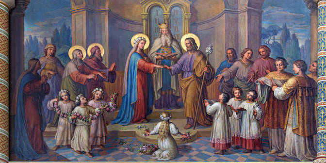 Lorsque la Bible nous dit que le pharaon ôtant son anneau le passa au doigt de Joseph, le fit revêtir l’habit de lin fin, lui mit au cou un collier d’or, le fit monter sur son char tandis que les héros clamaient devant lui : « À genoux ! », ne devons-nous pas voir ainsi prophétiser le triomphe de notre glorieux Joseph ? N’est-ce pas l’Église qui nous dit encore de lui, comme autrefois le pharaon : « Allez à Joseph. » Mettez-vous sous sa tutelle. Ayez confiance en sa sagesse et en son pouvoir ! Les deux chérubins sculptés sur l’Arche d’alliance sont « apparus comme le symbole de Marie et de Joseph dans l’attitude d’adoration où ils se tenaient à Bethléem autour du berceau de Jésus… » Deux évangélistes, Matthieu et Luc, nous donnent la généalogie qui établit que Joseph était bien de la lignée royale de David. « De qui le messie doit-il être le fils ? », demandera un jour Jésus aux pharisiens : « De David ! », répondront ceux-ci aussitôt. Et de fait, c’est souvent sous ce titre qu’on s’adressait à lui : « Jésus, fils de David ! » Saint Augustin commente : « Ne craignons pas de tracer la généalogie de Jésus par la ligne qui aboutit à Joseph, car de même qu’il est époux vierge, ainsi est-il père-vierge. Ne craignons pas de placer le mari avant l’épouse, selon l’ordre de la nature de la loi de Dieu. Si nous venions à écarter Joseph pour faire mention seulement de Marie, il nous dirait avec raison : pourquoi me séparez-vous de mon épouse ? Pourquoi ne voulez-vous pas que la généalogie de Jésus aboutisse à moi ? Nous lui dirions : parce que tu n’as pas engendré par l’œuvre de la chair ? Il nous répondrait : et Marie, a-t-elle engendré par l’œuvre de la chair ? Ce que le Saint Esprit a opéré en elle, il l’a opéré pour tous les deux. » Ainsi donc, Joseph clôturant la généalogie nous apparaît comme la clé qui ferme l’Ancien Testament et ouvre le Nouveau. Il appartient à la fois aux deux Testaments. Il est le dernier des patriarches de l’ancien, et le premier saint du nouveau. (p. 25)