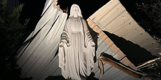Les rafales de 110 km/h qui ont soufflé sur la paroisse St. Stephen de Weatherford, au Texas (États-Unis), le soir du 2 mars 2023, n'ont pas fait le poids face à la Vierge Marie. Les Litanies de Lorette la dénomment justement « la Vierge très puissante ». Et il faut se souvenir que son Fils pouvait maîtriser les tempêtes ! Vers 17h30, le père Emmet O'Hara, SAC (Société de l'apostolat catholique - pallotins) et plusieurs autres personnes se trouvaient dans l'église et se préparaient à commencer l'adoration eucharistique, quand une tempête de force 4 s'est approchée. Le père O'Hara a pu observer les rafales impressionnantes à travers les portes vitrées de l'église. Les vents sont soudain devenus intenses, emportant l'énorme toit métallique du bâtiment annexe de la paroisse, qui a traversé le parking en direction de la statue de Marie et de l'église. Le prêtre et un autre paroissien ont eu le temps de dire un rapide « Je vous salue Marie »... et étonnamment, après avoir parcouru près de 100 mètres, le toit s'est arrêté derrière la statue en marbre de la Vierge, importée d'Italie. Le lendemain matin, la paroisse a lancé un appel aux Chevaliers de Colomb et autres volontaires pour venir déblayer les débris. Selon Todd Werts, responsable des affaires de la paroisse, « la réponse a été incroyable. Une trentaine de personnes se sont présentées pour aider », et les abords de l'église étaient en majeure partie nettoyés avant la messe de 9 heures. Le toit de l'église a été endommagé, l'annexe a subi des infiltrations, mais la statue de Marie n'a subi que quelques égratignures !