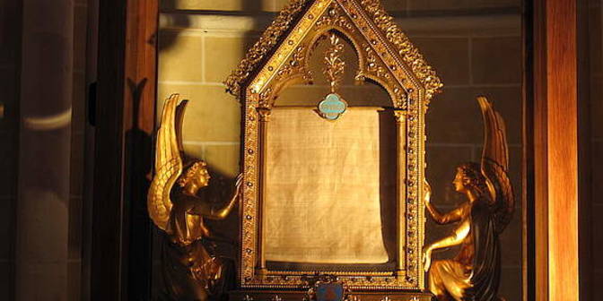 À Chartres (France), la célèbre relique du voile de la Vierge Marie est aujourd’hui exposée dans une nouvelle vitrine, depuis juillet 2020. Ce voile de la Vierge avait été offert à la cathédrale de Chartres, en l'an 876, par Charles le Chauve, petit-fils de l’empereur Charlemagne. Charlemagne avait lui-même reçu cette relique en cadeau de l'impératrice Irène de Byzance (ancien nom d’Istanbul en Turquie actuelle). Les plus grands rois se sont prosternés devant cette étoffe qui aurait été portée par Marie le jour de l'Annonciation ou de la Nativité. Cette relique incontournable de la chrétienté est vénérée depuis plus de 1000 ans et donne lieu à de grands pèlerinages à Marie. « Cette relique arrivée à Chartres suscite de grands pèlerinages. Cette relique majeure continue de toucher les cœurs aujourd'hui », explique le Père Emmanuel Blondeau, recteur de la cathédrale. À la Révolution française, le précieux reliquaire fut pillé, le voile découpé. Aujourd'hui, il ne reste plus qu’un morceau conservé dans un reliquaire qui date du XIXe siècle. « Ce tissu qui aurait 2000 ans risque de se dégrader avec le temps donc il a été convenu qu'on mette le reliquaire dans une vitrine. Cela préserve le voile sans que la vitrine vienne masquer le reliquaire », assure le Père Emmanuel Blondeau. N’hésitons pas, en ce temps de la Nativité - qui est aussi un temps de crise en ce mois de décembre - à venir vénérer et prier la Sainte Vierge, notre Mère, à travers ce vestige très probable de sa vie à l’heure de l’Incarnation de son Fils, Jésus.