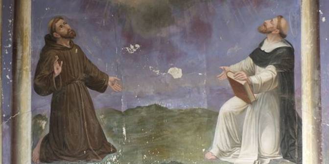 Alors la mère de Dieu présenta à Notre Seigneur le bienheureux Dominique. Je l'accepte, dit le Fils de Dieu, il fera très bien et avec zèle tout ce que vous avez dit. Elle lui présenta ensuite le bienheureux François, le Sauveur l'approuva également. Or le bienheureux Dominique, considérant attentivement dans cette vision ce compagnon qu'il ne connaissait pas encore, le rencontra le lendemain dans une église et le reconnut, d'après ce qu'il avait vu pendant la nuit. Il se jeta dans ses bras, et le tenant sur son cœur, il l'embrassait avec une sainte effusion, disant : Tu es mon frère d'armes ; tu marcheras avec moi du même pas et aucun ennemi ne prévaudra contre nous. Il lui raconta ensuite sa vision et dès lors, ils n'eurent plus qu'un cœur et qu'une âme en Dieu ; et ils recommandèrent à leurs fils qu'il en soit de même entre eux, toujours, en tout amour et révérence, et ce geste si simple a laissé sur l'océan des siècles un ineffaçable sillage, et les deux milices mendiantes y trouvent le symbole de leur éternelle alliance. C'est la raison pour laquelle le Patriarche des Prêcheurs a chez nous franciscains sa place et à lui aussi nous donnons le titre de Père.