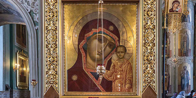L'icône miraculeuse de la Mère de Dieu de Kazan a ce regard triste des Vierges russes qui serrent tendrement l'Enfant Jésus contre elles. Recouverte auparavant d'une oklad - carapace d'or ou d'argent – et ornée de pierreries de grand prix, cette icône avait réputation de rendre la vue aux aveugles qui lui offraient, reconnaissants, des émeraudes parfaitement pures. On connaît son histoire depuis le grand incendie qui détruisit une partie de la ville de Kazan en 1579. L’icône est découverte cette année-là sous les décombres d'une maison brûlée, par une fillette de dix ans, à qui la Vierge apparait à plusieurs reprises en lui donnant l'ordre de chercher en cet endroit. Elle est ensuite vénérée comme la « Libératrice de Russie », l’étendard des victoires contre les Suédois ou contre Napoléon. Le dernier acte politique du Tzar Nicolas II, en 1918, est de lui consacrer son Empire. Il est arrêté quelques jours après et, sur l'ordre de Trotski, exécuté ainsi que toute sa famille. L'icône de Kazan disparait dans les horreurs de la Révolution russe. Beaucoup pensent qu’elle a été brûlée dans les grands autodafés d'icônes et d'images saintes de cette période, mais en 1965, on apprend qu'elle est en vente chez un grand antiquaire de New-York, sans son oklad et très abîmée. Le prix demandé, de 500.000 $, est fabuleux pour l'époque et le gouvernement soviétique est sur les rangs, mais les Russes de la diaspora la rachètent et la font restaurer. Elle est placée à Fatima, en raison des prophéties prononcées là-bas en faveur de la Russie, à la Domus Pacis, dans une chambre blindée de la chapelle qui lui est dédiée. Offerte à Jean Paul II lors d’une de ses visites sur place, celui-ci charge son légat, le Cardinal Walter Kasper, Président du Conseil Pontifical pour l'Unité des chrétiens, de la remettre aux Russes le 28 août 2004, en la fête de la Dormition de la Vierge, lors d’une longue cérémonie où la riche liturgie orthodoxe se déploie dans le cadre grandiose de la Cathédrale de la Dormition du Kremlin. A cette occasion, le Patriarche Alexis II remercie le Pape « de tout cœur pour cet événement qui est une contribution commune pour dépasser les conséquences négatives d'une histoire du XXe siècle marquée par une persécution sans précédent contre la foi au Christ ».
