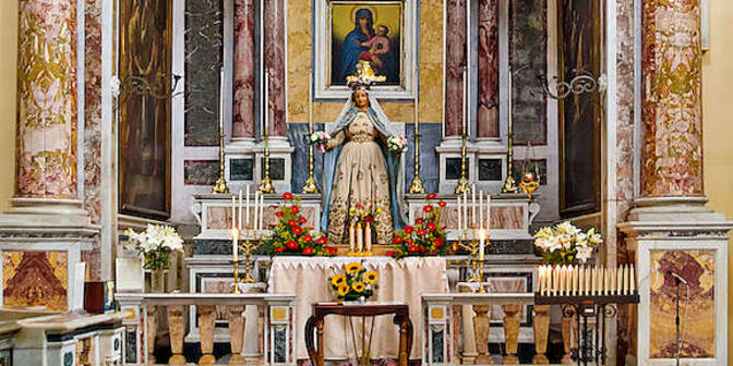 Jésus a voulu associer de manière unique et singulière sa Mère, la Vierge Marie, à l’œuvre de notre Rédemption, à l’œuvre du Salut. Chaque fois que Jésus renouvelle, si je puis dire, ou actualise plus exactement, le don de Lui-même sur la Croix, dans chaque Messe, la Vierge Marie est là au pied de la Croix. C’est pourquoi j’aime que dans les églises à côté de l’autel, il y ait l’image de la Vierge Marie, qu’elle ne soit jamais loin de l’autel, qu’elle soit proche de l’autel, parce que quand nous entendons Jésus dire à travers le prêtre : «Ceci est mon Corps livré pour vous, ceci est mon Sang versé pour vous et pour la multitude en rémission des péchés», si nous fermons les yeux, nous sommes au pied de la Croix. Jésus nous rejoint, même s’il est glorieux, ressuscité aujourd’hui et victorieux, il nous rejoint à travers sa Passion et sa Croix. Nous sommes au Calvaire ! Et Marie est là, et résonnent en même temps ces paroles : «Voici ta Mère» et à Marie : «Voici ton fils», et à partir de ce moment-là, il prit Marie chez lui, dans son intimité. Quand je reçois le Corps du Christ, je reçois en même temps Marie comme Mère.