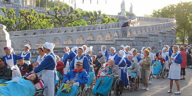 Ce qui frappe le plus le pèlerin de Lourdes, ou surtout le simple visiteur, c’est la présence de nombreuses personnes malades et handicapées, dans l'enceinte des sanctuaires. Que serait Lourdes sans eux ? Ils sont partout et ont partout, ici, la première place. Tous les blessés de la vie peuvent trouver à Lourdes un certain réconfort. À contrario, notre société fait comprendre, même indirectement, que la souffrance ne sert à rien et qu’elle est même un fardeau financier. Officiellement, 80 000 personnes malades et handicapées de tous les pays se rendent à Lourdes chaque année. Ils viennent prendre appui sur le rocher de la grotte pour puiser la force de faire face à leur souffrance physique ou morale, pour trouver un sens à leurs épreuves. Malgré le spectacle parfois insupportable de certaines plaies ou de certaines infirmités, on se sent ici dans un havre de paix et de joie. La joie, voilà bien la réalité de ce qui se vit dans le cœur de beaucoup de ces personnes durant leur passage à Lourdes. Dans l’imaginaire collectif, Lourdes est la cité des miracles, c’est-à-dire la cité des guérisons miraculeuses. Les premières guérisons de Lourdes sont survenues pendant les apparitions. Presque aussitôt, des malades ont commencé à venir à la grotte, de plus en plus nombreux et de plus en plus loin. À cette époque, la vue des malades émeut si profondément certains qu’ils proposent spontanément leur aide. Le groupe de ces hommes et ces femmes de bonne volonté n’a cessé de croître, rendant aujourd’hui mille services dans les accueils de malades, à la gare, puis à l’aéroport, sur l’esplanade du rosaire, à la grotte, aux piscines. Ce sont les hospitalières et les hospitaliers. Les malades comme les soi-disant bien portants se retrouvent au pied de la grotte des apparitions, devant la Vierge Marie : ils se portent les uns les autres par les sourires croisés, les gestes échangés et la prière partagée.