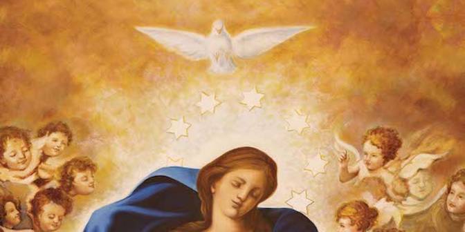 Sur le tableau de Marie qui défait les nœuds, au-dessus de la tête de la Vierge Marie, plane une colombe, symbole de l’Esprit Saint, qui illumine le haut du tableau d’une lumière toute céleste. Comme le dit le père Zannini (1) : « L’Esprit Saint avec Marie devient le formateur du Verbe Incarné. Il agit sur l’âme, le cœur et la chair de la Vierge en les remplissant de tous ses dons, de toutes ses grâces, de tout son amour infini, et c’est ainsi qu’il élève ce chaste sein à la hauteur du sein du Père et qu’il prépare au Verbe ce corps immaculé que le Verbe incarné fait sien. Il acquiert sur le Fils du Père, comme homme, une autorité qu’il n’avait jamais eue auparavant. C’est en se penchant sur son humanité, en la remplissant de toute sa sainteté, en lui donnant ce baiser d’amour infini qu’il fait de l’Homme-Dieu, le Saint de Dieu (Jn 6, 29). Et Jésus le dira lui-même : "L’Esprit Saint est sur moi parce qu’il m’a consacré par l’onction pour porter la bonne nouvelle aux pauvres" (Lc 4, 18). C’est encore le même Esprit qui forma Jésus en Marie, qui le fit sortir de son sein et qui le fit sortir vivant du tombeau et vainqueur de la mort. Et comme l’Esprit a ressuscité Jésus, il ressuscitera tous les membres de son Église, parce que par Marie, il a obtenu puissance et juridiction sur tout le corps du Christ qui est l’Église. »