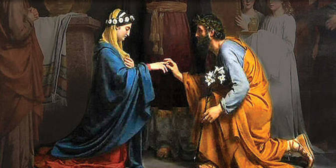 Marie était parfaite et très belle, Joseph devait l’aimer passionnément. Il est probable qu’ils avaient fait très jeunes vœu de virginité et de célibat, pensant hâter ainsi la venue du Messie. Mariage et consécration, est-ce compatible ? ... Leur unité de cœur et d’âme dépasse toute expérience humaine, car elle est enracinée dans le choix de Dieu et elle est toute orientée vers l’Enfant (…). N’est-il pas troublant et même contradictoire que Marie soit donnée en exemple à la fois aux personnes consacrées et aux personnes mariées ? C’est vrai : dans toute la tradition spirituelle, Marie est contemplée comme le modèle et la Reine des vierges et des consacrés. Cela n’empêche pas une tradition plus récente de voir aussi en Marie et Joseph le modèle des époux ; la fête de la famille a bien ce sens d’exemplarité. Cet apparent paradoxe confirme qu’il est impossible de réduire le mystère incomparable de Marie (et par conséquent de Joseph) à l’une ou l’autre de nos expériences. Ni d’un côté ni de l’autre nous n’avons à « copier » Marie. En revanche nous avons tous beaucoup à apprendre auprès d’elle. Reine et Mère, elle a le charisme d’inspirer et de former les disciples. Quelle que soit leur vocation.