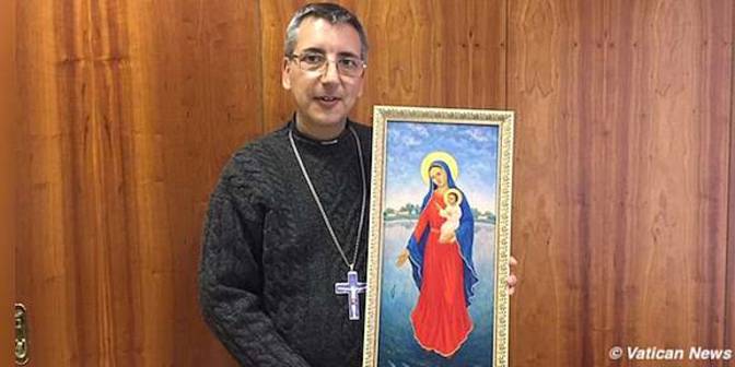 Mgr José Luis Mumbiela Sierra, évêque du diocèse de la Sainte-Trinité à Almaty (Kazakhstan), était en visite à Rome au début de l’année 2019. Il a apporté avec lui un tableau qu'il a fait faire pour commémorer un événement historique, et qu’il a offert au Pape : « Ce tableau représente un moment particulier de l’histoire d’une partie de la population catholique du Kazakhstan, située dans une ville du nord du pays peuplée de Polonais déportés ici en 1935-1936. » C’était en 1941, et la famine sévissait dans la petite ville : « La température était autour de -40 à -50 °C, et il y avait 2 mètres de neige… essayez de vous nourrir dans des conditions pareilles ! », explique Mgr Sierra. Dans cette situation, « les braves Polonais se tournent vers la Vierge et lui demandent le miracle de son intercession. Et voilà que, vers le 25 mars 1941, la neige se met à fondre, puis un lac se forme, dans lequel des poissons apparaissent ! Et grâce à ces poissons, les gens ont été sauvés, ainsi que d'autres personnes des villages voisins. » « Lors du centenaire de la Vierge de Fatima, à peu près la même situation s'est reproduite », raconte-t-il. « Nous ne pouvons pas dire avec certitude que cet événement est un miracle de la Vierge, mais en tous cas le cœur des croyants y voit la main toute maternelle de la Vierge, qui intercède pour ses enfants. » « Il n’y avait jamais eu auparavant d’image spéciale pour commémorer cet événement historique, alors j’ai commandé un tableau pour le représenter. Ce n’est pas Marie elle-même qui donne le poisson, mais c’est l’Enfant Jésus, dans les bras de la Vierge, qui donne le poisson à sa Mère, et ensuite sa Mère jette le poisson dans les filets, qui sont nos prières, jetés dans le lac de la miséricorde. »