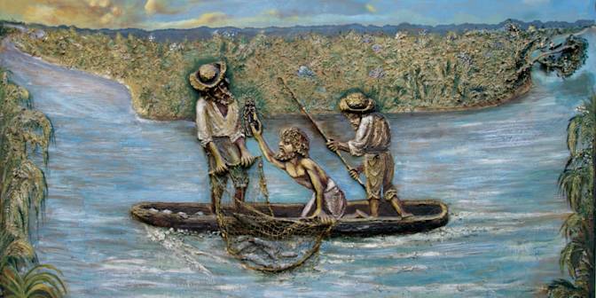 En septembre 1717, à 180 km de São Paulo, au Brésil, trois pêcheurs, Domingos Garcia, Felipe Pedroso et Joao Alves, découvrent une petite statue de l’Immaculée conception, de couleur sombre et au visage souriant, qu'ils ont pêchée dans leur filet - dans lequel ils prennent ensuite des poissons en abondance. Les pêcheurs l’appellent « Aparecida », ce qui signifie : celle qui est apparue, qui fut trouvée là par surprise.