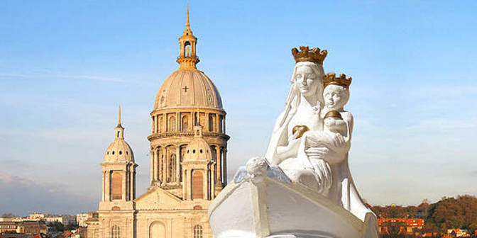 L’apparition de la Vierge à Boulogne-sur-Mer (nord de la France) est rapportée dans des manuscrit de la fin du Moyen Âge. Le récit est simple, en voici l’essentiel : Cela se passe vers l’an 636 : une très belle dame arriva sur mer en bateau, dans une nacelle, sans voile, sans corde et sans aviron. Les bourgeois à qui elle était apparue lui demandèrent son nom. Elle répondit qu’elle était « ’avocate des pécheurs, la source de grâce, la fontaine de piété ». Puis, la Vierge leur délivra son message : « Je veux qu’une lumière divine descende sur vous et sur votre ville... Mes amis, faites incontinent édifier en mon nom une église. » Vers 1100, la Comtesse Ide, de Boulogne, qui deviendra Sainte Ide, fait construire une église romane. À partir du XIIe et XIIIe, les pèlerins affluent à Boulogne qui devient une étape sur le chemin de Saint Jacques de Compostelle. On s’arrête à Boulogne, en venant d’Angleterre ou des Pays-Bas, ou en remontant d’Espagne ou d’Italie. Le XVIe s. est celui des guerres de religion. À Boulogne, les Huguenots s’acharnent contre la cathédrale, brisent les vitraux, brûlent les boiseries et surtout essaient de briser la statue puis de la faire brûler, en vain. Elle est finalement jetée sur un tas de fumier puis dans un puits. La femme d’un Huguenot, très pieuse, la retire secrètement du puits et la cache dans son grenier, où elle restera plus de 30 ans avant de regagner la cathédrale. Elle est en très mauvais état, mais la reprise des miracles prouve son authenticité. En 1630, Mgr Le Bouthillier rebâtit la cathédrale. Mais en 1789, avec la Révolution, églises et couvents sont déclarés propriétés de l’État. Le mobilier est vendu ou détruit. La statue est brûlée en 1793. La main droite, qui s’était détachée peu avant, est le seul vestige de la statue originale. À partir de 1820, la cathédrale sera reconstruite. De 1943 à 1948, quatre reproductions de la Vierge de Boulogne, appelée aussi « Notre-Dame du Grand Retour », chacune montée sur un char, parcoururent 120 000 km à travers la France, visitant 16 000 paroisses, en provoquant un élan de foi, de prières et de conversions sur son passage. La statue de la Vierge portée sur un bateau s’accompagnait d’une demande de délivrance de la France qui prend tout son sens aujourd’hui.
