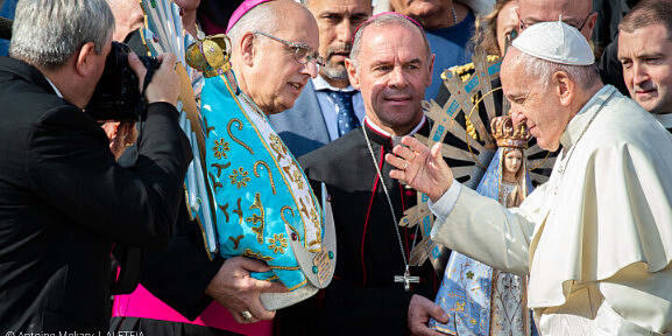 Le 30 octobre 2019, un geste historique s’est déroulé place Saint-Pierre à Rome, en présence du Pape François: une copie de la statue de la Vierge de Luján, sainte patronne de l’Argentine, a été restituée par Mgr Paul James Mason, évêque aux Armées du Royaume-Uni, à son homologue argentin Mgr Santiago Olivera. La statue avait été emportée par les troupes britanniques durant la guerre des Malouines (Falkland) en 1982. C’est une rétrocession, mais aussi un don réciproque : une autre copie de la statue de la Vierge de Luján a en effet été donnée par Mgr Santiago Olivera, ordinaire militaire de l'Argentine, à Mgr Mason, son homologue anglais, ce mercredi matin. Présent place Saint-Pierre pour l’audience générale, le Pape François, lui-même argentin, a béni les deux statues. La demande d'échange entre deux exemplaires de la statue de la sainte patronne de l'Argentine avait été faite en 2018. Il s’agit là d’un geste supplémentaire de réconciliation entre les deux pays qui s'opposèrent lors de la guerre des Malouines (Falkland), entre avril et juin 1982, l’Argentine et le Royaume-Uni se disputant le contrôle de cet archipel du sud de l’océan Atlantique, faiblement habité mais dont les eaux territoriales pourraient abriter d'importantes ressources pétrolières. Après de violents combats, les Britanniques l'emportèrent et les îles retournèrent sous le contrôle du Royaume-Uni. Le conflit a fait plus de 900 morts. Dans un communiqué de la Conférence épiscopale du Royaume-Uni publié le 27 septembre dernier, Mgr Mason explique que ce geste permet de «manifester une communion dans la foi entre deux pays qui ont connu des divisions politiques». Mgr Santiago Olivera a quant à lui fait part de sa satisfaction. Retraçant les étapes franchies pour parvenir à cet échange, il met en évidence le symbole de fraternité entre l'Argentine et le Royaume-Uni, et d'unité pour l'Argentine elle-même, le pays faisant face à divers défis.
