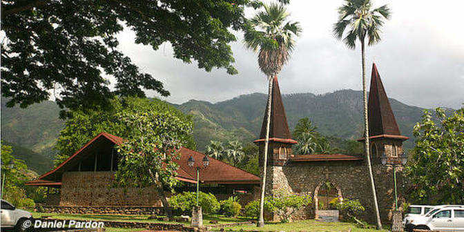 En 1848, Monseigneur Dordillon(1) entama son travail d'évangélisation des Îles Marquises. Aujourd’hui, la foi catholique est très ancrée aux Marquises. L'occasion de jeter un œil au « petit Vatican » marquisien, la très respectée « Notre Dame des îles Marquises ». Fichée au beau milieu de la baie de Taiohae, chef-lieu de l’île de Nuku Hiva, la cathédrale Notre-Dame des Îles Marquises se dresse en retrait de la mer, au lieu-dit Mauia. Depuis 1975, elle cristallise la foi des paroissiens de ce diocèse des Mers du Sud. L’île de Nuku Hiva est au cœur de l’archipel des Marquises en Polynésie française. Le chemin qui mène à la cathédrale est indiqué, sur la route qui borde la baie de Taiohae, par une croix marquisienne sculptée, érigée sur une pierre levée. Elle marque l'entrée de la Mission catholique qui abrite entre autres l'école Saint Joseph. C'est le roi Temoana, de Nuku Hiva, qui offrit le site au diocèse catholique, après s'être converti au catholicisme à l’époque de Mgr Dordillon(1), évêque fondateur de l'église marquisienne. Mort en 1888, après 40 ans d'évangélisation réussie, Mgr Dordillon repose au cœur même de la cathédrale, sous une dalle au pied d'une grande statue de la Vierge. (1) Prêtre picpussien français qui fut envoyé aux Îles Marquise pour les évangéliser et dont il devint évêque.