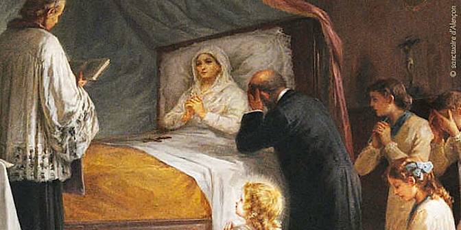Dans la joie comme dans l’épreuve, sainte Zélie Martin (mère de sainte Thérèse de l’Enfant Jésus, née en 1831, décédée en 1877 et canonisée le 18 octobre 2015 par le pape François) s’est tournée vers Marie, la « Vierge du Sourire ». Elle savait que la Mère de Dieu accompagne chaque événement familial, qu’elle guérit, console et affermit ceux qui l’invoquent lorsque survient une affection grave comme le cancer. Quand Zélie découvre la maladie qui la touche, après le choc de la nouvelle, elle choisit d’entrer progressivement sur la voie de l’abandon. Épouse et mère, elle vit cette épreuve comme une extraordinaire occasion de renouveau intérieur. Chaque instant la rapproche davantage de Jésus. Tout au long de sa maladie, elle se confie à l’intercession de Notre Dame. N’ira-t-elle pas à Lourdes lui confier sa santé ? De retour, comprenant que la fécondité de sa vie est d’entrer dans la voie d’une oblation encore plus totale au Père, Zélie fait l’expérience d’un authentique bonheur, de la véritable joie. Ses jours désormais vont illuminer ceux qui l’entourent, et la lumière du Ciel prendra le pas sur la nuit. Sainte Zélie peut devenir auprès de qui est touché par la maladie, une amie et une aide précieuse pour vivre le temps de l’épreuve avec Jésus et à Marie.