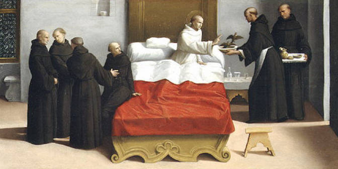 Saint Nicolas de Tolentino (1246-1305), moine de l'Ordre des Ermites de saint Augustin, jeûnait à toutes les veilles de fête de la Sainte Vierge ainsi que tous les samedis de l’année, au pain et à l’eau. Comme il était un jour fâché parce qu’à cause d’une grave maladie, ses supérieurs l’avaient obligé à rompre son jeûne, la Vierge Marie lui témoigna à sa façon combien elle était touchée de sa grande dévotion : elle fit revivre et s’envoler deux perdrix rôties qu’on avait servies à Nicolas lors du premier repas où il devait rompre le jeûne. Le soir suivant, elle lui présenta du pain trempé dans un verre d’eau, ce qui fut le remède par lequel elle le guérit d’une fièvre maligne dont aucun médecin n’était venu à bout ! Et la Vierge promit à Nicolas que ce même remède servirait, après la mort de ce dernier, à tous ceux qui l’utiliseraient en l’invoquant. De là vient le miraculeux petit pain de saint Nicolas que l’on bénit chaque année dans les couvents de saint Augustin, un pain béni qui opère tous les jours des merveilles.