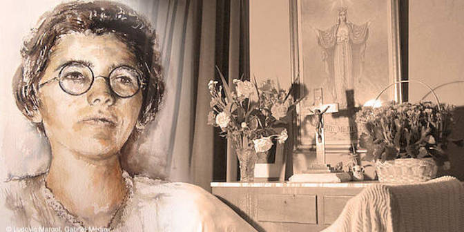 C’est toute la vie de Marthe Robin (1902-1981), ses activités quotidiennes à la ferme qui sont imprégnées de grâce mariale. On trouve ces pensées, dans les notes de sa main : J’aime tant en effet tout remettre aveuglément entre les mains de cette tendre et Bien Aimée Mère dont la protection se fait de plus en plus sentir à son enfant. Pour ne pas voir ma confiance dépassée par les bienfaits de la Sainte Vierge, il me faut espérer d’elle des choses sans limites. (2/11/32 ; J.I. n°3). Je voudrais arriver avec l’aide et le secours de la Sainte Vierge à transformer ma vie naturelle en une vie toute surnaturelle et divine. Mais que ne puis-je pas si je sais me faire aider par Elle, et si je la prie avec cette confiance d’enfant à laquelle Elle ne se dérobe jamais. O Ma Mère, régnez sur mon âme… faites régner Jésus en moi ! … Je remets entre vos mains bénies tous les actes de ma vie pour qu’ils soient présentés à mon Roi et Seigneur Jésus. (4/03/30). O Marie, ô ma bien douce maman, obtenez-moi en ce beau jour du ciel l’abandon complet, l’abandon parfait, l’abandon plein d’amour à l’Amour. Que par vous, avec vous, en vous, Vierge très pure : j’aime, j’adore, je prie, j’expie, je supplie et souffre avec toujours plus d’amour. Que ma vie ne soit plus qu’un oui d’amour… Que je ne sois plus qu’une âme toute consacrée… à Jésus. (7/03/30). Approfondissant cette attitude, Marthe dira : Tout le programme de ma vie consiste à me tenir unie à Marie, ma Mère, sous la dépendance du Maître intérieur qui me dirige, à me laisser envahir, dévorer, consumer par Dieu (…) (11/05/32).