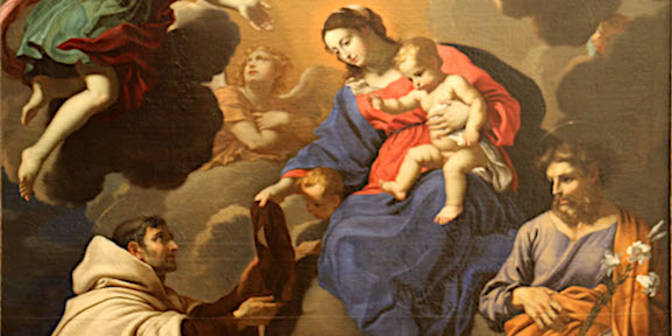 L’Ordre du Mont Carmel, installé sur une montagne surplombant la mer Méditerranée entre Nazareth et Haïfa est né à la fin du XII ème siècle. A l’époque le mont Carmel était en Palestine ; aujourd’hui il appartient au territoire israélien. Il est l’héritier des ermites et prophètes qui vécurent sur le mont dans le souvenir du prophète Elie. Après l'invasion des lieux saints par les musulmans, il dut s'exiler en Europe et là, mal connu, fut bientôt sur le point de disparaître. C'est le moment que choisit Notre Dame pour intervenir. Elle apparut, en 1251, à saint Simon Stock, alors général de L'Ordre, qui n'avait cessé de l'implorer afin qu'elle ne permette pas la disparition de cet Ordre Carmélitain qui lui était si dévoué. La Vierge Marie lui remit un scapulaire qui devait se porter au-dessus des habits. Notre Dame faisait ainsi don à saint Simon Stock de la livrée de ses serviteurs afin qu'elle fût portée par tous les carmes. Elle l'accompagnât de ces paroles : « Reçois, mon fils ce scapulaire, comme le signe d'une étroite alliance avec moi. Je te le donne pour habit de ton ordre (…). Quiconque meurt revêtu de cet habit sera sauvé. »